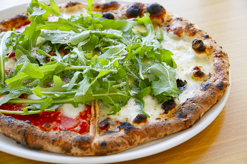 フレッシュなルーコラを添えた、マルゲリータD.O.C とクワットロフォルマッジのハーフ&ハーフピッツァ。