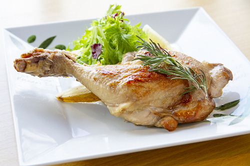 骨付きのモモ肉を低温でふっくらジューシーに火入れしました。